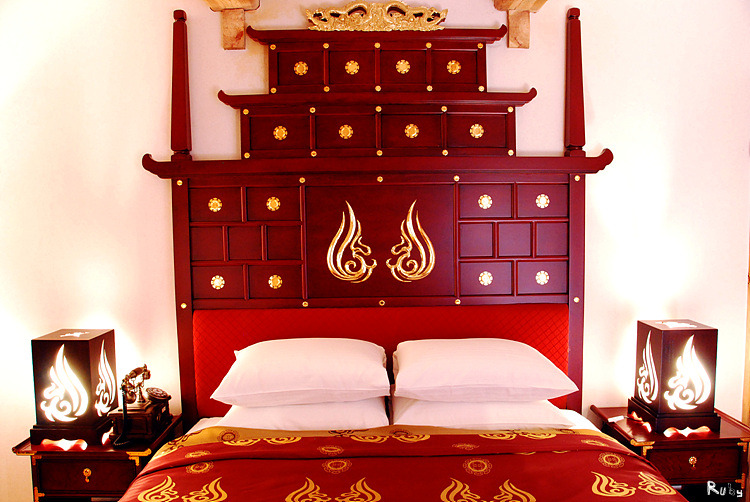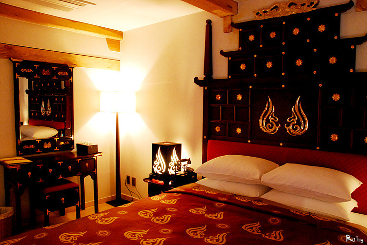 불꽃 모양 스탠드를 밝히고 붉은 빛에 금빛 수를 놓은 침구 속에 파묻히면 마치 신라의 임금이 된 듯한 호사를 누릴 수 있을 것 같다.
