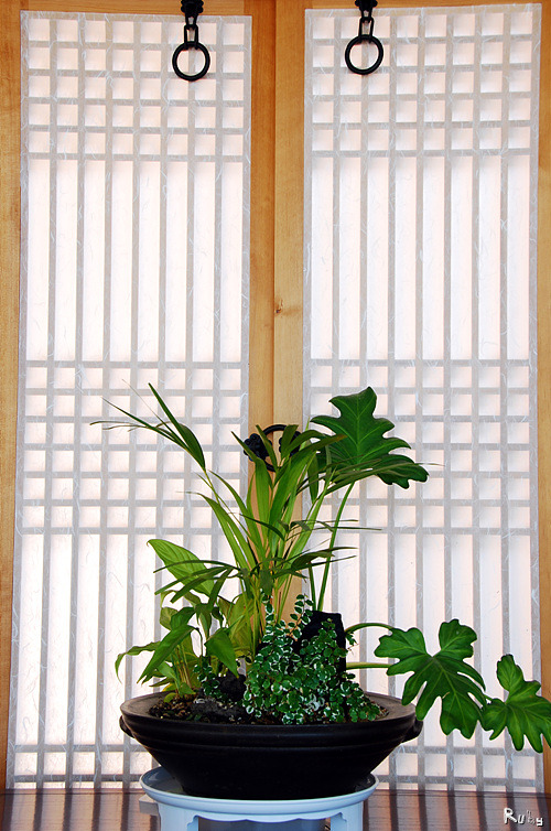 한지로 된 문살 앞에 휴식하듯 놓인 화분과 토기,가구들은 보는 이들의 마음을 편안하게 한다.